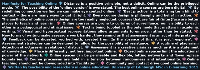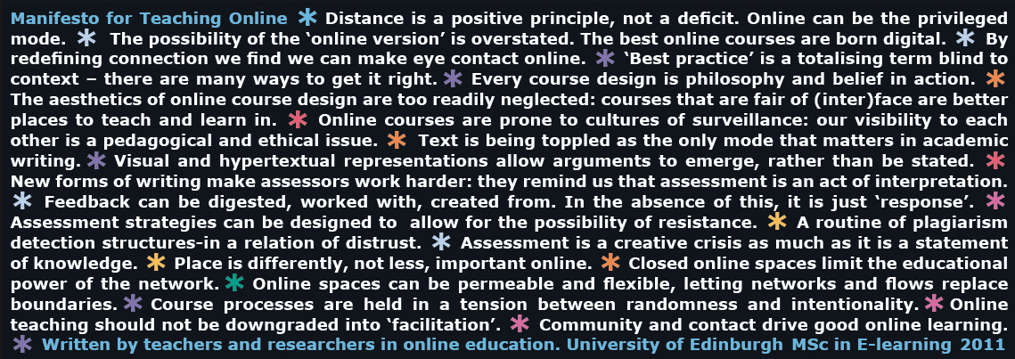 I saw the link to it on Stephen Downes page. Stephen noted that it was a manifesto for TEACHING online rather than LEARNING online.